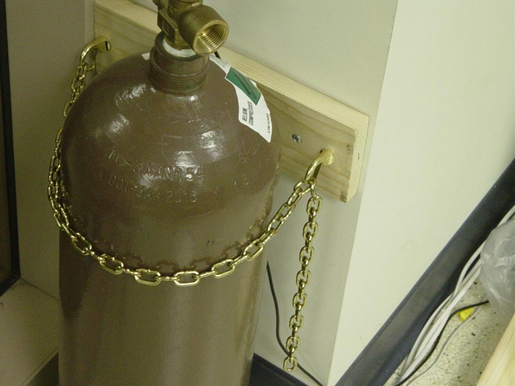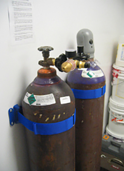 If you’d prefer to keep your tanks mobile, you can purchase floor stands that are designed specifically for compressed gas cylinders. The brackets for properly securing compressed gas cylinders can be found online through supply warehouses, or you can go to your local hardware store and purchase the materials and secure the tanks yourself (view the photos below to see examples of properly secured tanks).