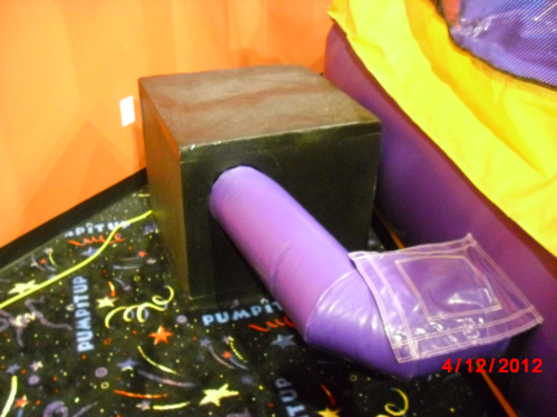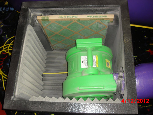 The accompanying photos below show how the noise containment boxes are constructed. The first two were made by the inflatable operator using materials commonly found at local building supply stores. They are fairly easy to construct and effectively reduced the noise in the FEC bounce room from 79 dB to 63 dB.